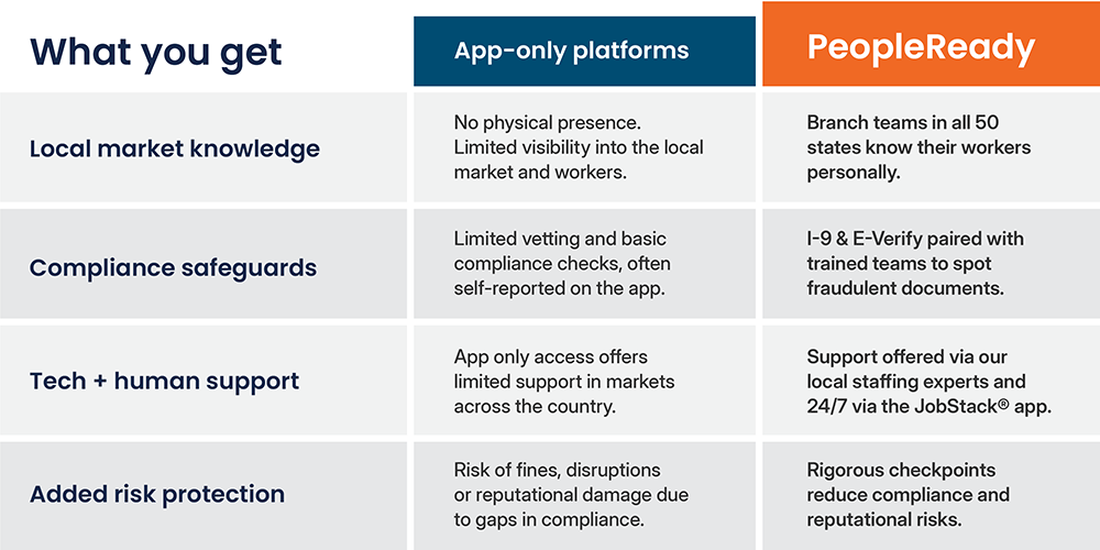 Digital-only staffing platforms may provide convenience, but they can leave businesses exposed to unnecessary risk. With PeopleReady, you get the speed of technology plus the confidence of local teams who know their workers and your market.